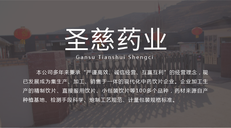 甘肅天水圣慈藥業(yè)有限公司成立于2016年11月8日,注冊(cè)資本500萬元,位于甘肅省天水市張川回族自治縣張川鎮(zhèn)中城南路,本公司多年秉承“嚴(yán)謹(jǐn)高效、誠信經(jīng)營(yíng)、互贏互利”的經(jīng)營(yíng)理念,現(xiàn)已發(fā)展成為集生產(chǎn)、加工、銷售于一體的現(xiàn)代化中藥飲片企業(yè)。企業(yè)加工生產(chǎn)的精制飲片、直接服用飲片、小包裝飲片等100多個(gè)品種,藥材來源自產(chǎn)種植基地、檢測(cè)手段科學(xué)、炮制工藝規(guī)范、計(jì)量包裝規(guī)格標(biāo)準(zhǔn)。